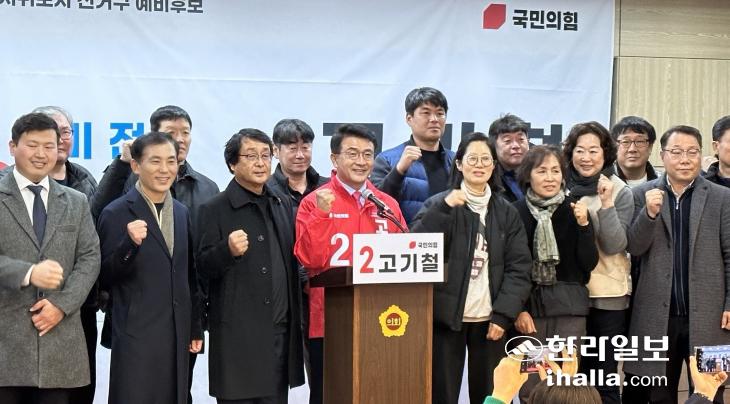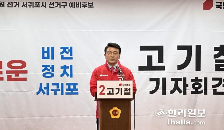 고기철 국민의힘 예비후보가 19일 제주도의회 도민카페에서 제22대 국회의원선거 출마 기자회견을 열고 있다.