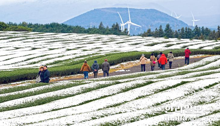19일 서귀포시 표선면 한 녹차농원을 찾은 관광객들이 눈 쌓인 녹차밭 탐방로를 산책하고 있다. 강희만기자
