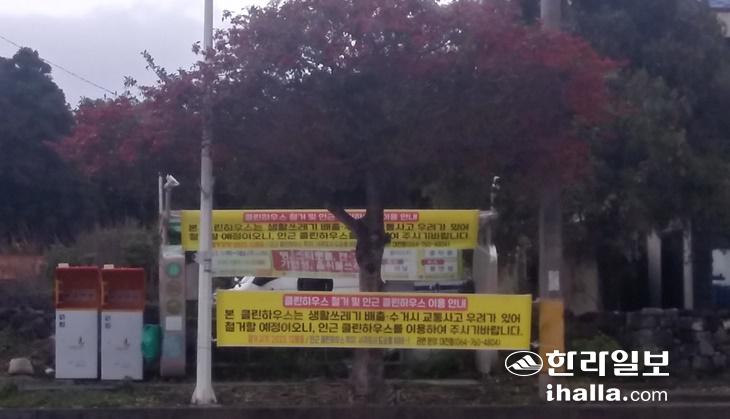 서귀포시 대천동에 교통사고 예방 등을 위한 클린하우스 철거를 알리는 현수막이 나붙어 있다. 진선희기자