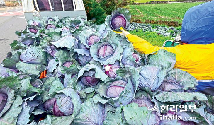 20일 제주시 한경면 고산리 한 밭에서 농민들이 적채 수확 작업을 하고 있다. 이상국기자