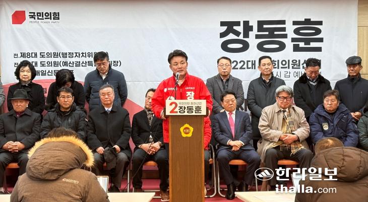 장동훈 국민의힘 예비후보가 21일 제주도의회 도민카페에서 제22대 국회의원 선거 제주시갑 출마를 선언하고 있다.