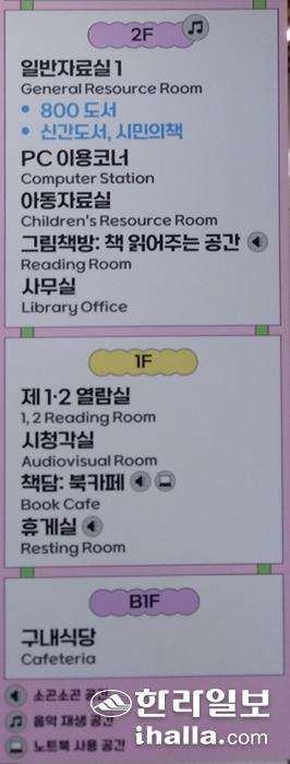 층별 음악 재생, 대화 가능 공간 등을 알리는 중앙도서관 안내판.