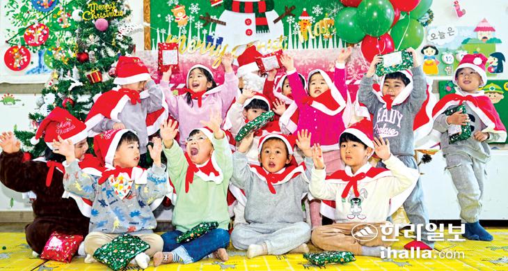 21일 제주시 키즈빌어린이집 원아들이 산타할아버지의 선물을 받고 기뻐하고 있다. 이상국기자