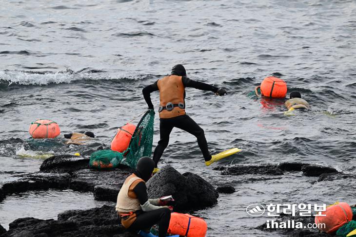 26일 서귀포시 대정읍 바다에서 해녀들이 물질을 하기 위해 바다로 뛰어들고 있다. 이상국기자