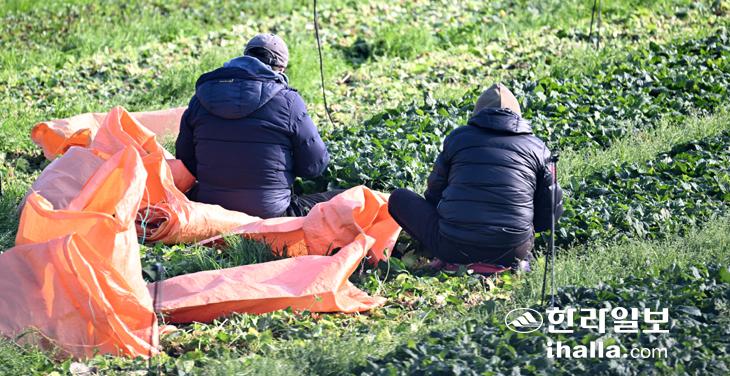 27일 제주시 애월읍 애월리 한 농경지에서 어르신들이 취나물 수확 작업을 하고 있다. 강희만기자