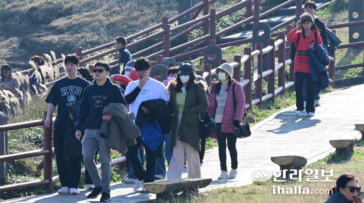 포근한 날씨를 보인 27일 성산일출봉을 찾은 관광객들이 두꺼운 외투를 벗고 산책로를 걷고 있다. 이상국기자