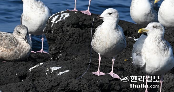 27일 제주시 한림읍 한림항 갯바위에 올라 휴식을 하고 있는 재갈매기 한마리가 낚싯바늘을 삼킨 모습으로 카메라에 포착돼 충격을 주고 있다. 강희만기자