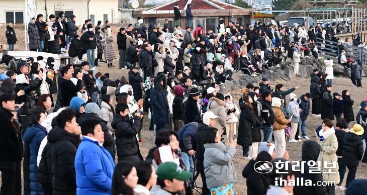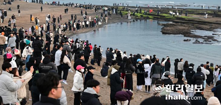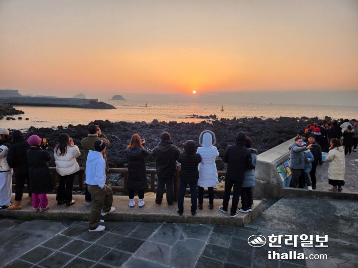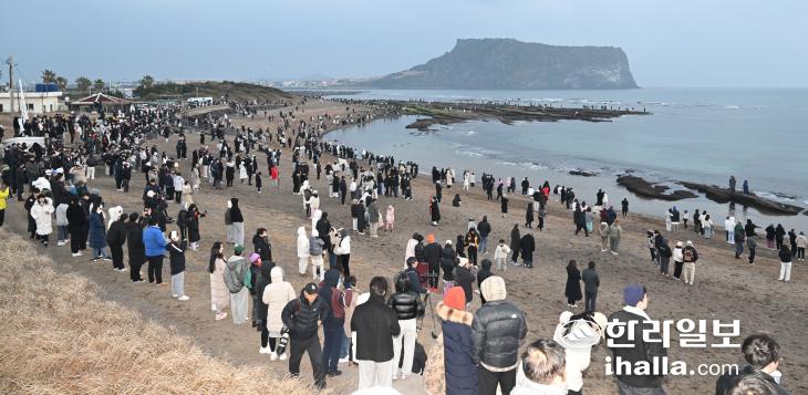 2024년 첫날인 1일 서귀포시 성산읍 고성리 광치기해변을 찾은 관광객과 도민들.