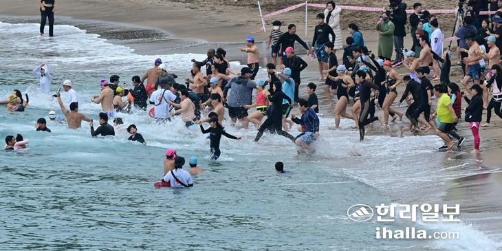 2024년 새해 첫날인 1일 중문색달해수욕장에서 열린 제25회 서귀포 겨울 바다 국제펭귄수영대회 참가자들이 희망찬 출발을 다짐하며 바다로 뛰어들고 있다. 이상국기자