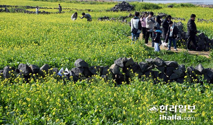 2일 서귀포시 성산일출봉 인근 유채밭을 찾은 관광객들이 봄 같은 제주의 겨울 정취를 만끽하고 있다. 강희만기자