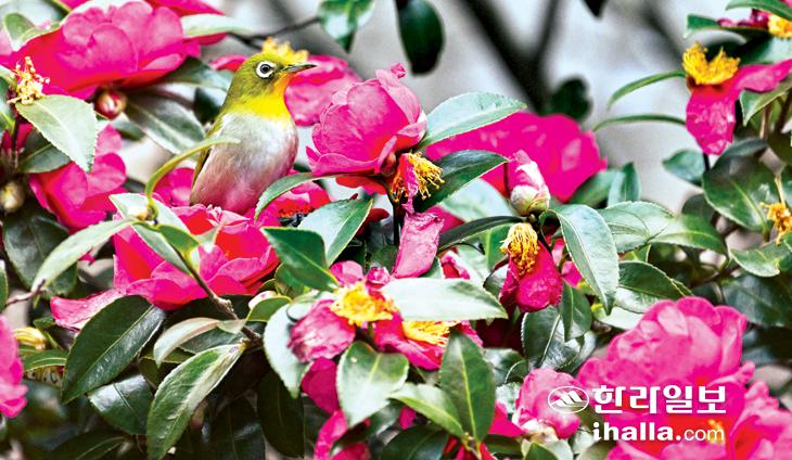 4일 제주시 노형동 한 주택 화단에 활짝 핀 애기동백꽃에 동박새 한 마리가 살포시 앉아있다. 강희만기자