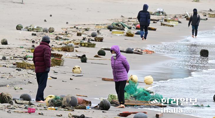 휴일인 7일 제주시 이호테우해수욕장 모래사장에서 시민들이 대거 밀려온 해양쓰레기를 피해 맨발걷기를 하고 있다. 이상국기자