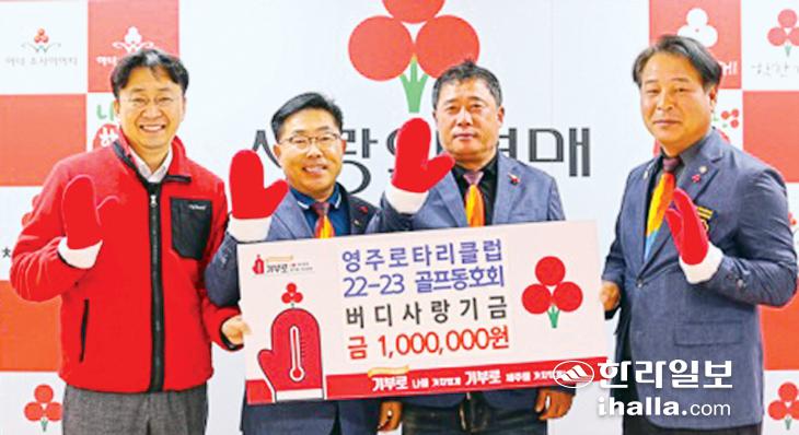 제주영주로타리클럽 2022-2023 골프동호회(회장 육창근)는 최근 제주사회복지공동모금회(회장 강지언)를 방문해 버디사랑기금 100만원을 희망2024나눔캠페인 이웃사랑 성금으로 기탁했다.