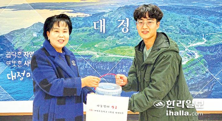 서귀포시 대정초등학교(교장 김이)는 지난 8일 대정읍사무소를 방문해 대정읍 관내 취약계층을 돕는 사업에 사용해 달라며 대정초등학교 5학년 학생들이 운영한 나눔 장터 수익금을 기탁했다.