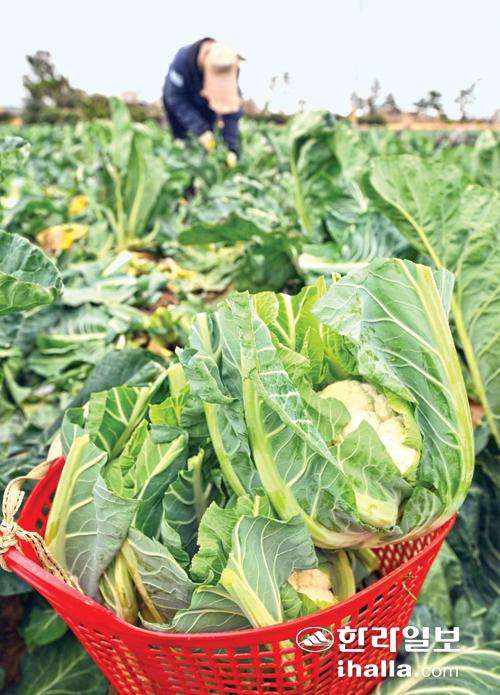 9일 제주시 한경면 지역의 한 농경지에서 농민들이 칼리플라워 수확을 하고 있다. 이상국기자
