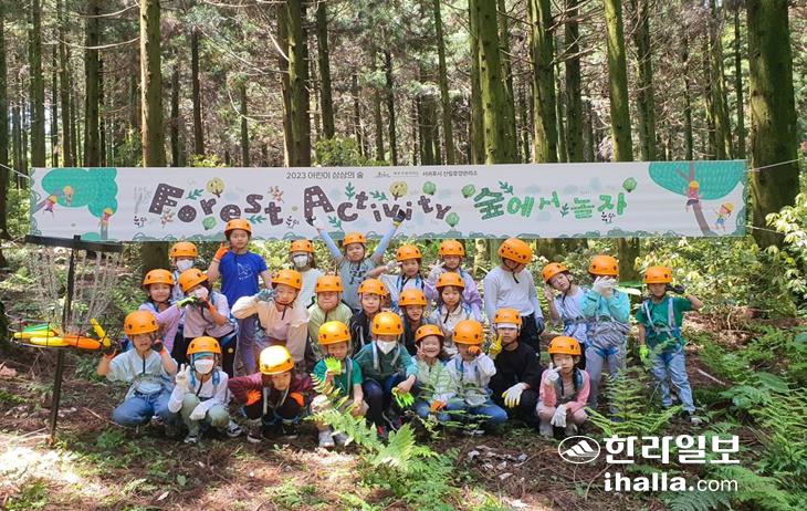 붉은오름자연휴양림 어린이 상상의 숲 참가자들이 기념 촬영을 하고 있다. 서귀포시 제공