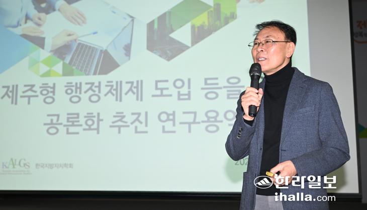 '제주형 행정체제 도입 등을 위한 공론화 추진 연구용역' 최종 보고회에서 용역진이 용역 결과를 발표하고 있다. 이상국기자