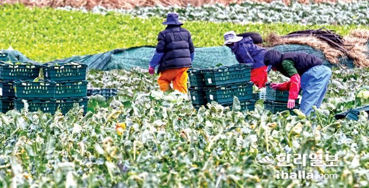 11일 서귀포시 대정읍 하모리 한 농경지에서 농민들이 브로콜리 수확 작업을 하고 있다. 강희만기자