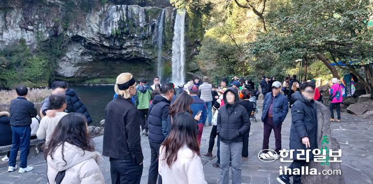 14일 서귀포시 천지연폭포를 찾은 관광객들이 시원하게 떨어지는 폭포수를 배경으로 사진을 찍고 있다. 강희만기자