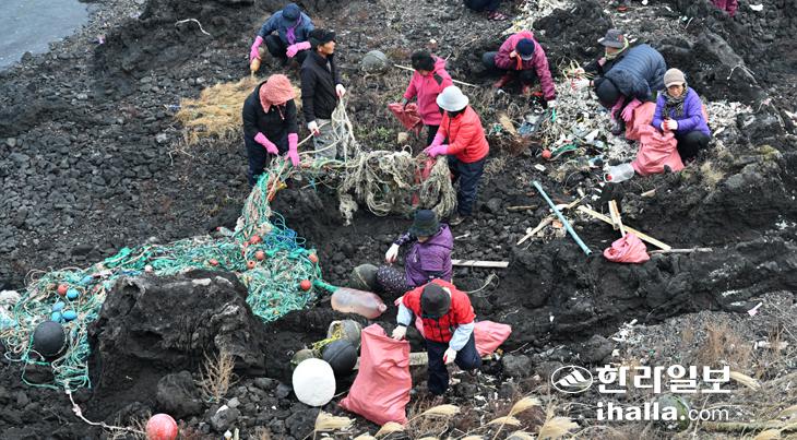 12일 제주시 도두동 해안에 해양쓰레기들이 파도에 밀려오자 마을 해녀들이 수거 작업을 하고 있다. 강희만기자