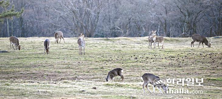 17일 제주시 용강동 제주마방목장에서 꽃사슴들이 풀을 뜯어 먹고 있다. 강희만기자