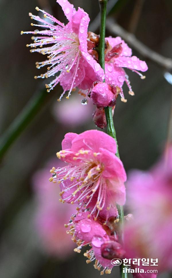 18일 제주시 오라동 한 사찰 정원에 겨울비를 머금은 홍매화가 활짝 피어 눈길을 끌고 있다. 강희만기자
