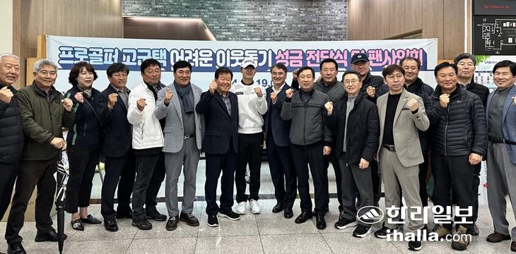 서귀포시 남원읍 출신 고군택 프로골퍼가 지난 19일 남원읍을 찾아 이웃 돕기 성금, 마을발전기금을 전달한 뒤 마을 관계자 등과 기념촬영을 하고 있다. 남원읍 제공