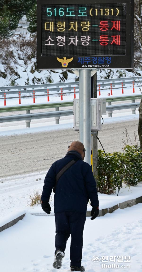 23일 516도로가 통제됐다는 전광판 안내가 보이는 가운데 한 시민이 걸어서 눈길을 이동하고 있다. 이상국기자