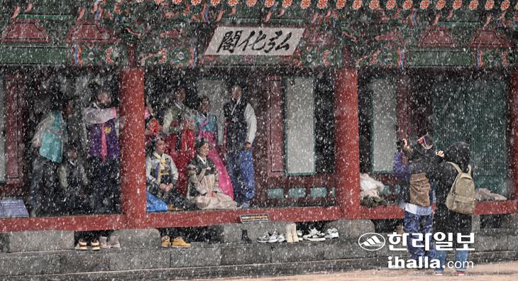 23일 제주시 제주목관아를 찾은 중국인 관광객들이 한복을 입고 눈 내리는 풍경을 배경으로 사진을 찍고 있다. 강희만기자