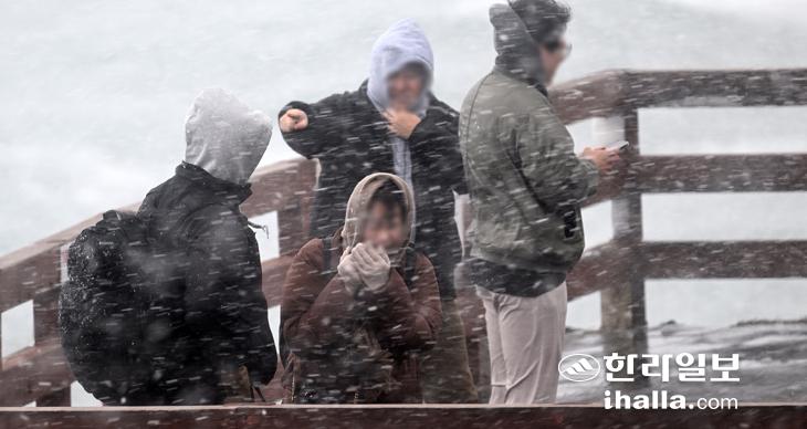 강한 눈보라가 이어진 23일 제주시 용두암을 찾은 관광객들이 매서운 눈보라를 맞고 있다. 강희만기자