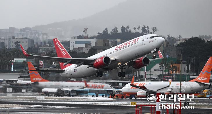 24일 매섭게 몰아친 강한 바람과 폭설이 한풀 꺽이며 항공기 운항이 정상화한 제주국제공항 활주로에 항공기가 힘차게 이륙하고 있다. 강희만기자
