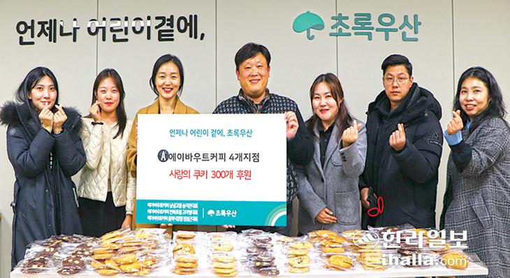 에이바우트커피 남녕고점(대표 송지은), 연북로점(대표 고아형), 연동 신시가지점(대표 이현호), 올레시장점(대표 정영근)은 지난 22일 초록우산 제주지역본부(본부장 변정근)을 통해 제주시내 보육원 3곳의 원아 및 종사자들을 위한 쿠키 300세트를 후원했다.