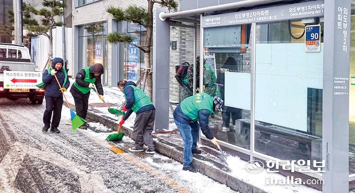 새마을지도자 외도동협의회(회장 정재성)는 지난 23일 회원 10여 명이 참여한 가운데 제주시 외도동 지역 내 버스승차대와 도로변 등에 대한 제설작업을 실시했다.