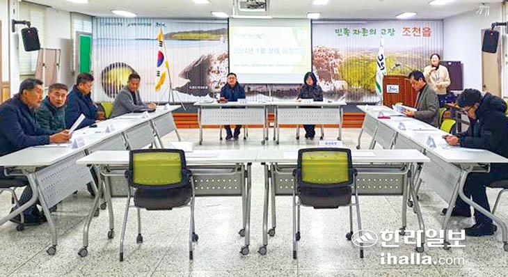 제주시 조천읍(읍장 양정화)은 지난 23일 읍사무소 회의실에서 이장 9명과 관계자 등이 참석한 가운데 2024년 1월 정례회의를 개최하고 임기가 만료된 이전 이장에게 감사패 등을 전달했다. 또한 제주 4·3보상금 신청, 복지제도 개선, 자동차세 연납 및 봄철 산불 조심 기간 등에 대한 홍보를 당부했다.