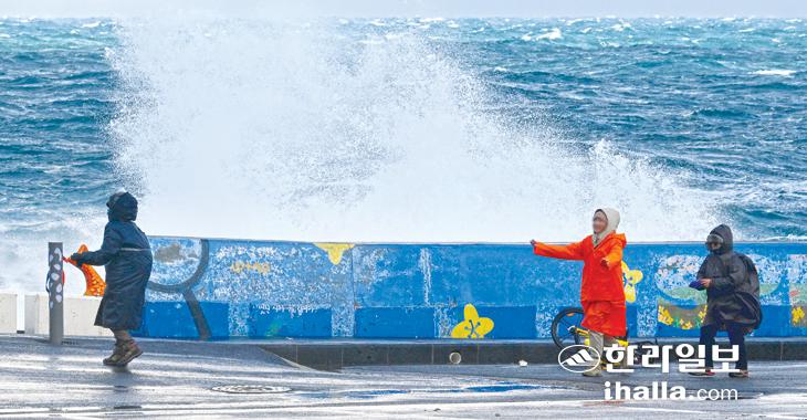 24일 제주시 용담동 어영마을 해안가에 높은 파도가 밀려와 바닷물이 해안도로로 넘치고 있다. 강희만기자