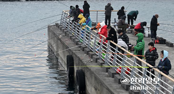 27일 제주시 구좌읍 세화항 방파제에서 많은 사람들이 멸치(멜)낚시를 즐기고 있다. 강희만기자