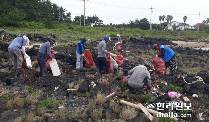 서귀포시에서 채용한 바다환경지킴이들이 해안으로 밀려온 쓰레기를 수거하고 있다. 서귀포시 제공