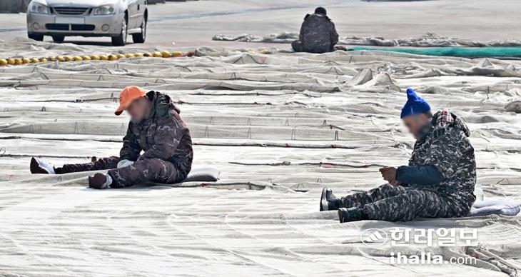 29일 제주시 한림항에서 어민들이 덤장그물 보수작업을 하고 있다. 강희만기자