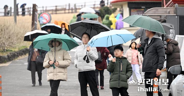 겨울비가 내린 30일 서귀포시 성산읍 성산일출봉을 찾은 관광객들이 우산을 쓰고 탐방에 나서고 있다. 강희만기자