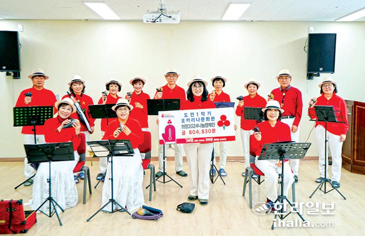 공연수익금을 기부하고 있는 도민1악기 오카리나 문화원 회원들.