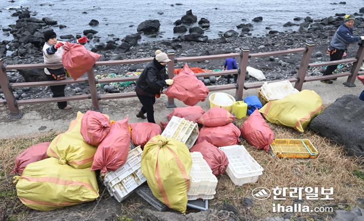 30일 제주시 애월읍 해안가에서 바다지킴이들이 뭍으로 밀려온 해양쓰레기를 치우고 있다. 이상국기자