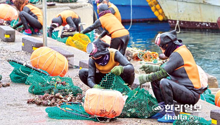 30일 제주시 한경면 자구내포구에서 해녀들이 물질로 잡은 뿔소라를 정리하고 있다. 이상국기자