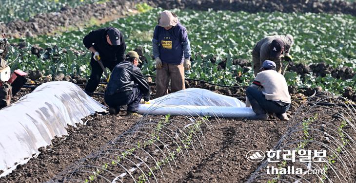31일 제주시 한림읍 수원리에서 농민들이 비트 파종을 마치고 비닐 씌우기 작업을 하고 있다. 강희만기자