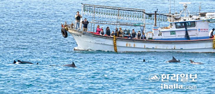 31일 서귀포시 대정읍 해안가 선박에서 관광객들이 유영하는 제주남방큰돌고래를 바라보고 있다. 강희만기자