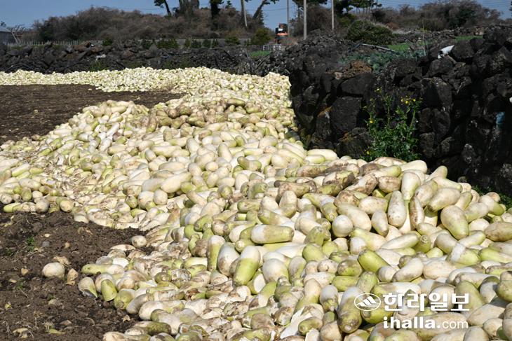 1일 서귀포시 대정읍 동일리 한 농경지에 수확한 후 세척한 월동무가 버려져 있다. 강희만기자