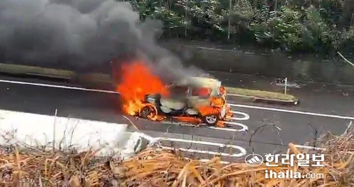 제주시 평화로에서 주행 중인 차량에서 불이 났다. 사진 독자 제공