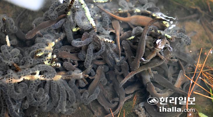 입춘인 4일 제주시 애월읍 중산간 깊은 계곡 물속에서 제주도롱뇽들이 나뭇가지에 알을 낳고 있다. 강희만기자