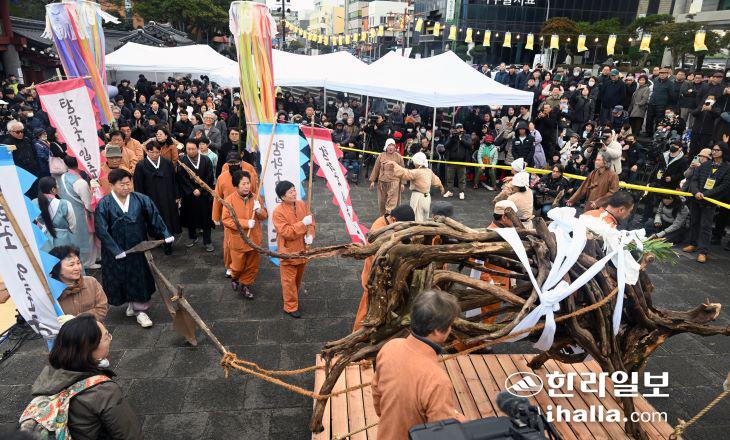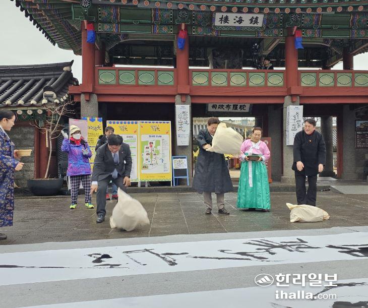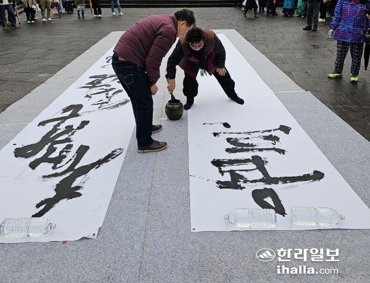 '2024 탐라국입춘굿' 행사 첫날인 2일 관덕정 마당에서 강창화 서예가가 큰 붓으로 올해 입춘휘호를 써내려가고 있다. 오은지기자