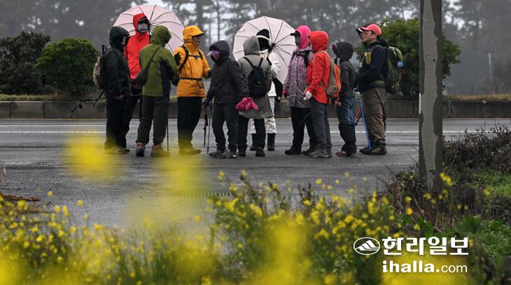 겨울비가 내린 5일 제주시 한경면 용수리 올레길에서 올레꾼들이 빗속 여정을 잇고 있다. 강희만기자