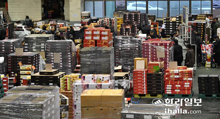 5일 제주시 일도2동 제주시농협 농산물공판장에서 설에 쓰일 제수용 과일들을 경매하고 있다. 강희만기자